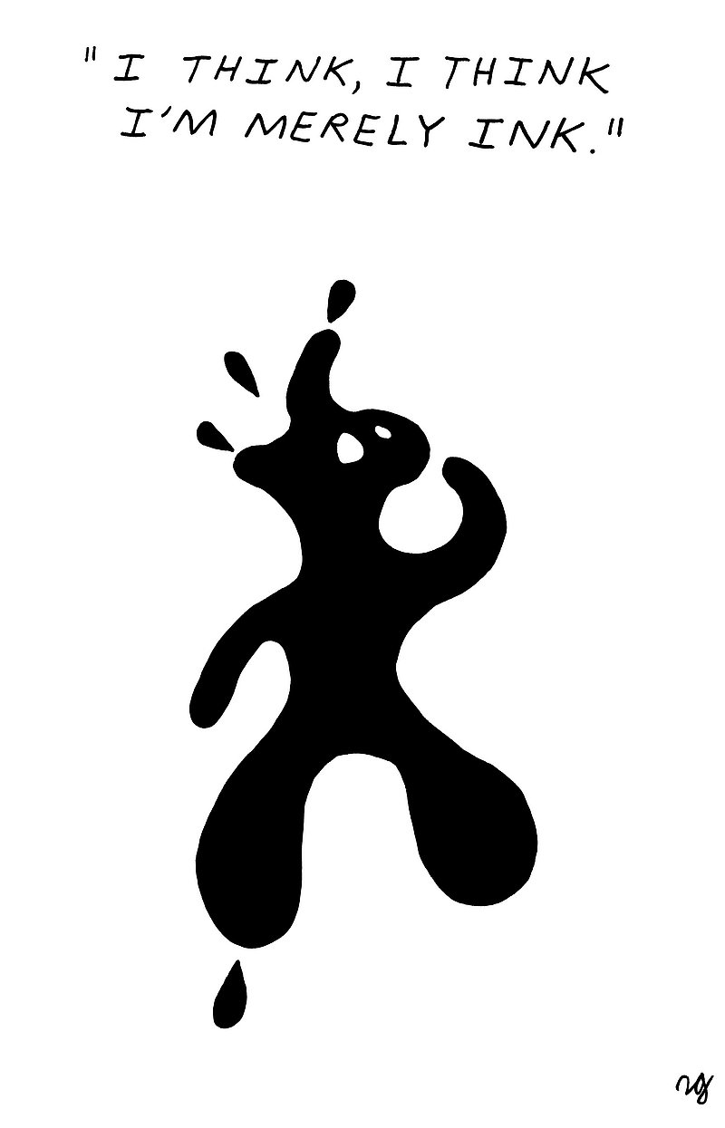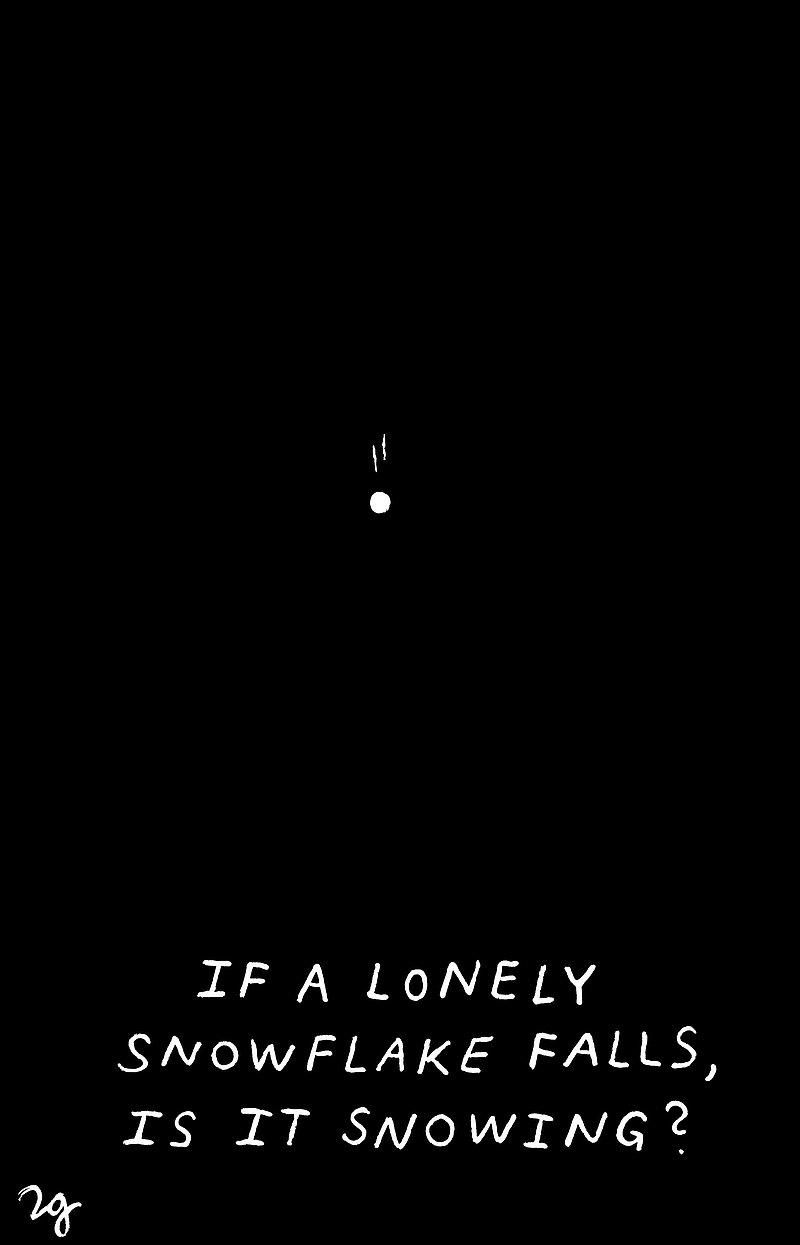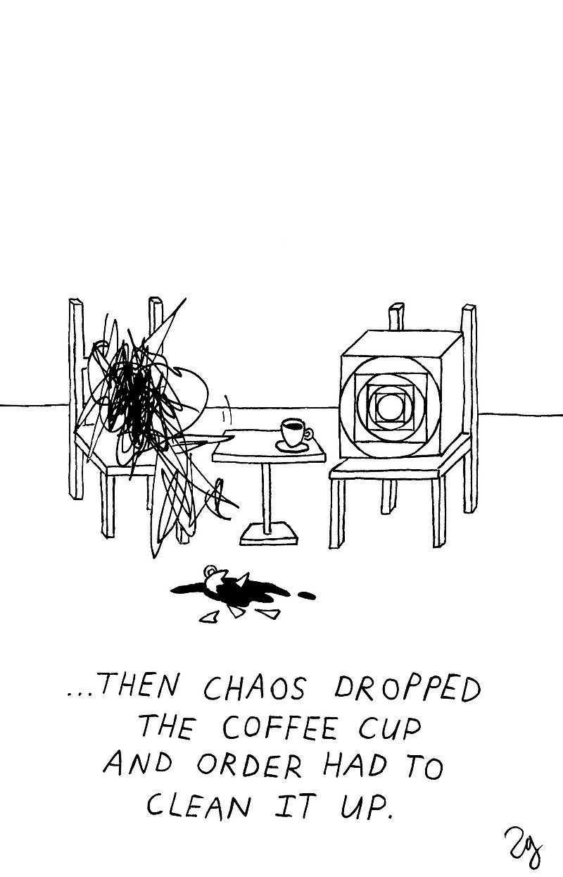 Accompanying text: Lawrence Grimm, born in Zurich 1978, is of Australian, German, Swiss nationality. After being involved in acting for years, he studied film at the Zurich University of the Arts, won various short film prizes and was voted Student Academy Award finalist for his diploma film. The experience of telling stories in pictures he has transferred to the world of cartoons and illustrations, scribbling moments of life, love, loops and loners in black ink. His cartoons have been displayed in exhibitions and are online. www.teatimeforauniverse.com